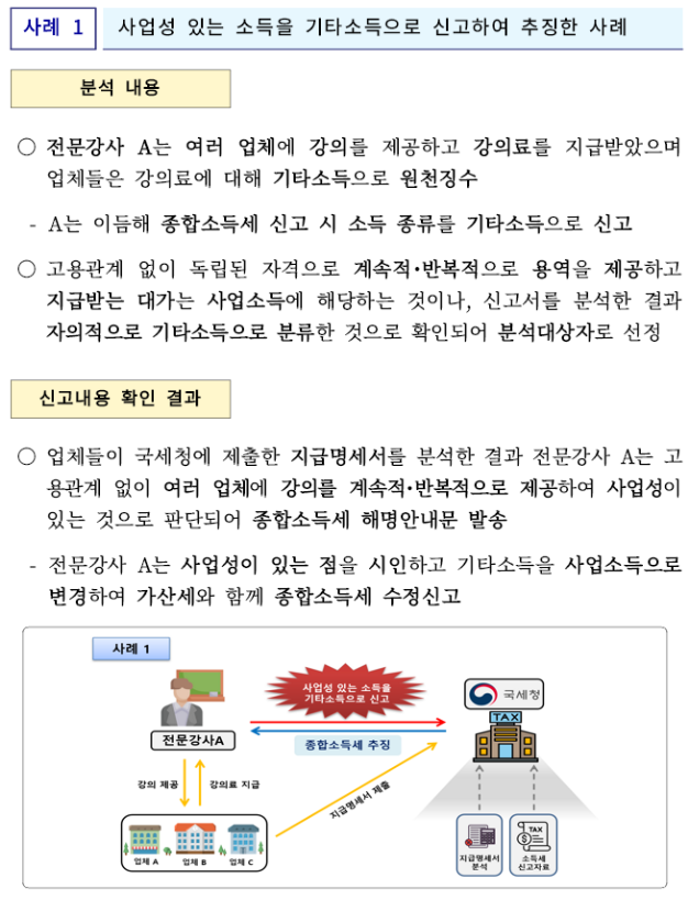 기타소득으로 신고했더라도 '계속, 반복적'으로 사업을 하고 있다면 사업소득으로 추징
